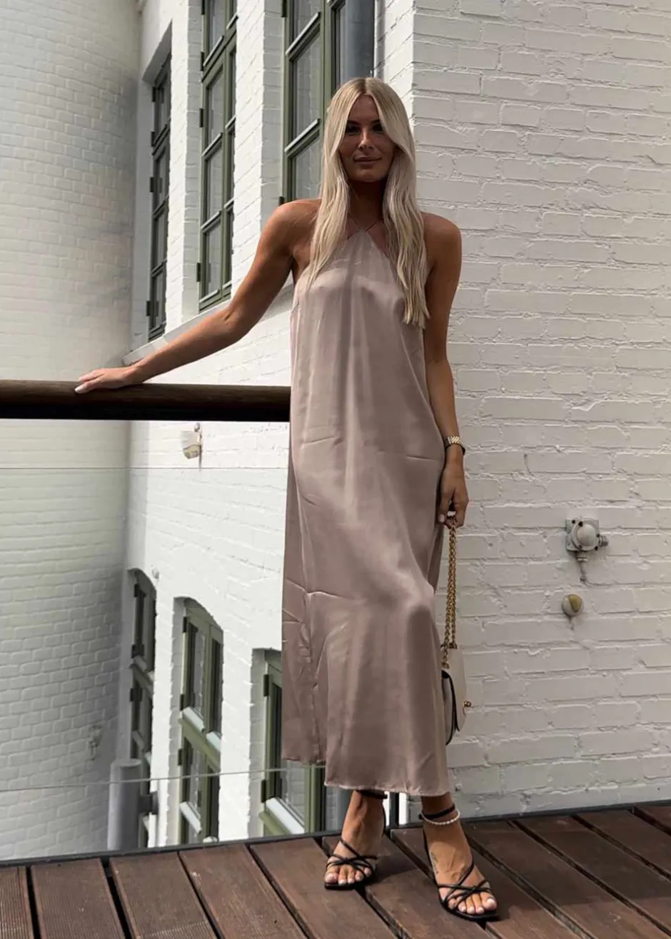 TulaMD dress er en eksklusiv satinkjole i midi længde med en A-formet silhuet. Kjolen har halterneck ved halsen med smalle stropper. Kjolen er stor i størrelsen så vi anbefaler at tage en størrelse mindre end man plejer.