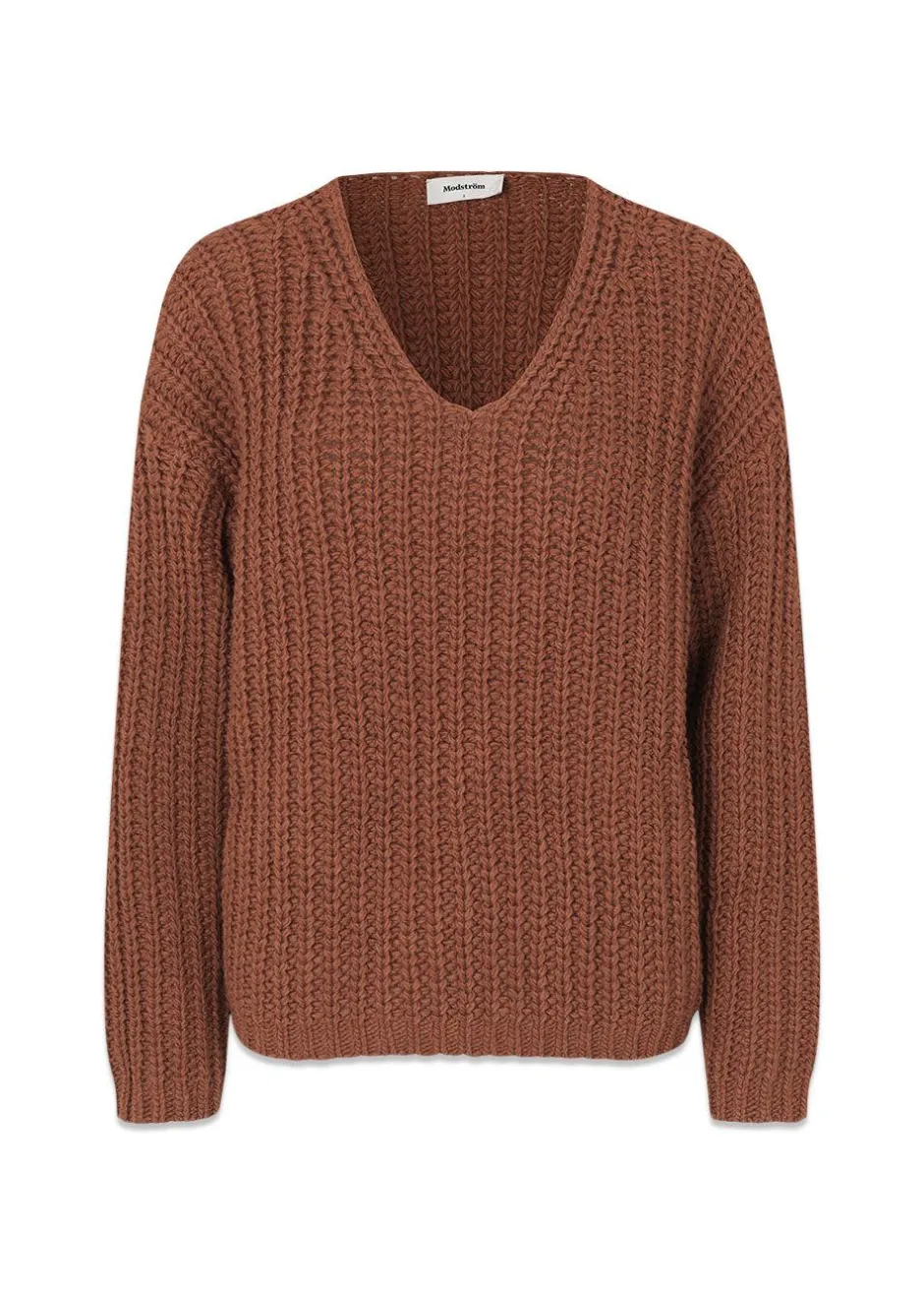 Felipemd v-neck er en chunky striktrøje i farven Maple. Strikken har en afslappet pasform, v-udskæring og lange ærmer med ribkant forneden.
