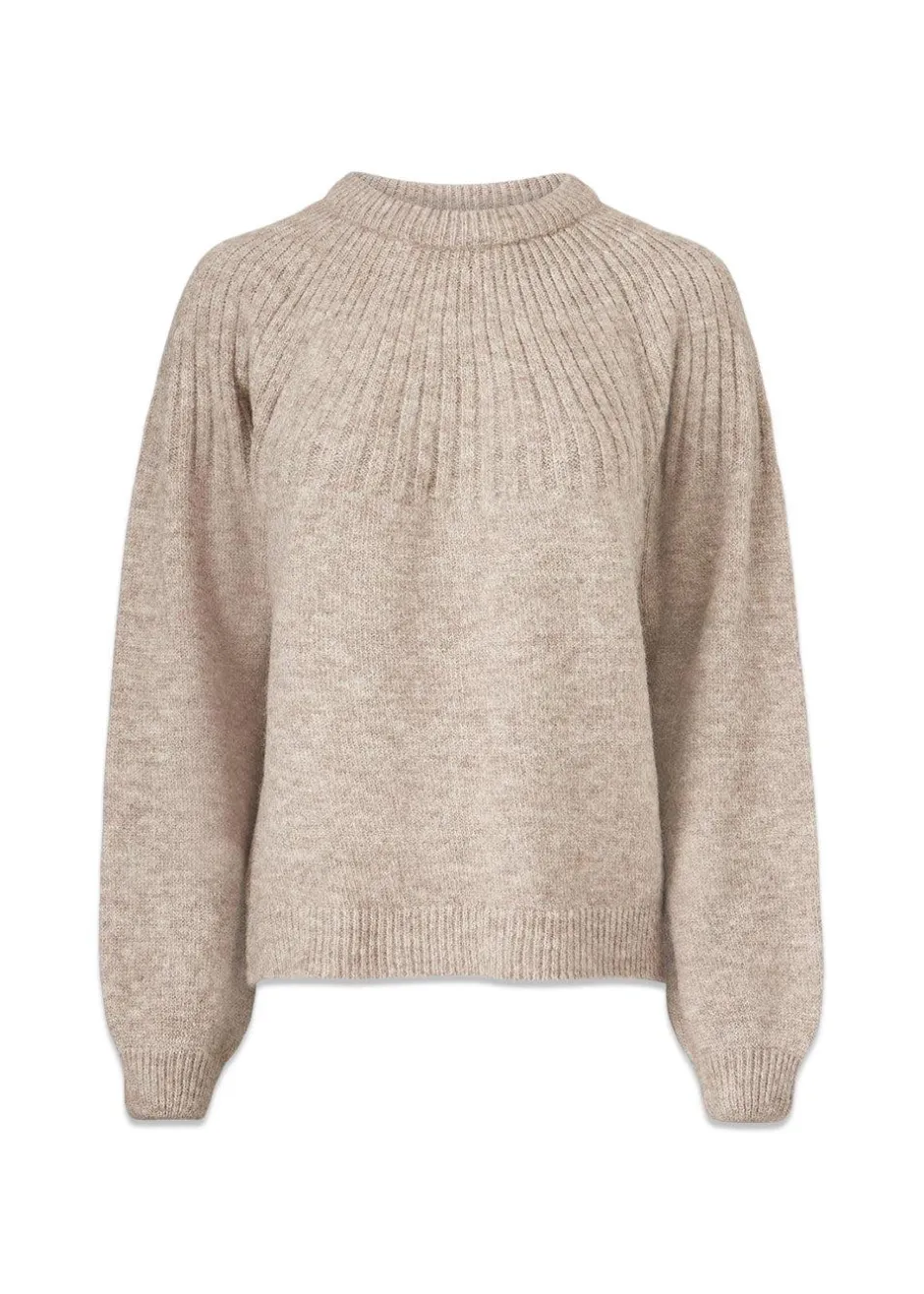 Truce O-neck er en lækker strik med mønster på brystet og ribkant ved ærmer, hals og bund. Denne strik er i farven Beige Melange og kan bruges både til de kølige sommeraftener og om vinteren.