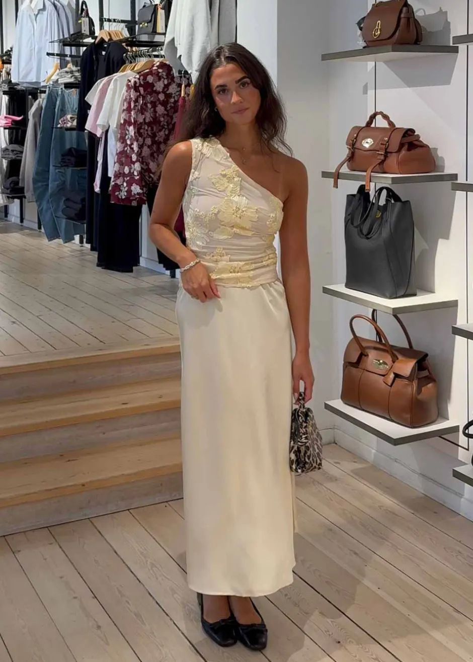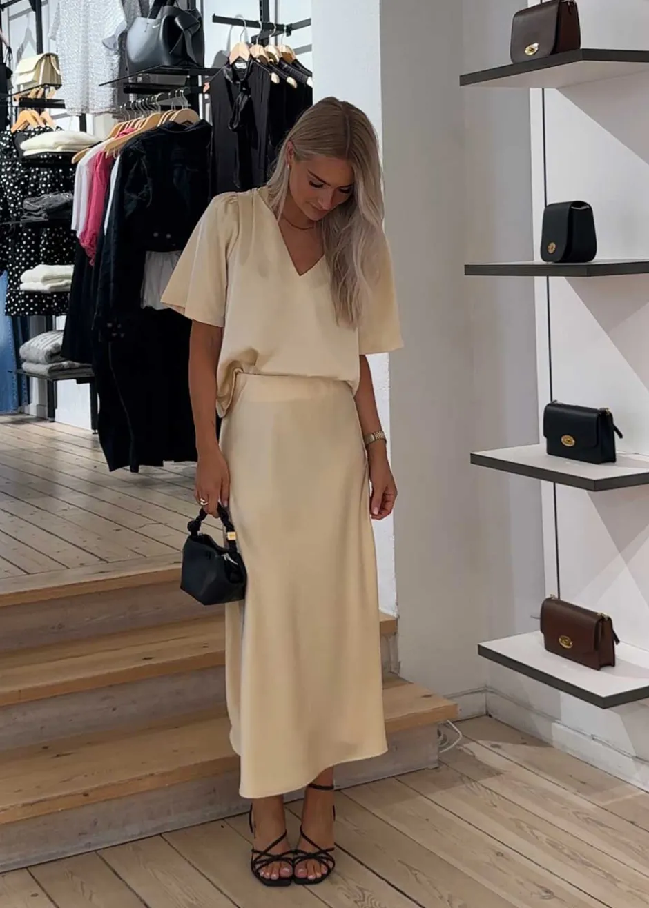 - Nederdelen er skåret let på skrå så den falder rigtig flot