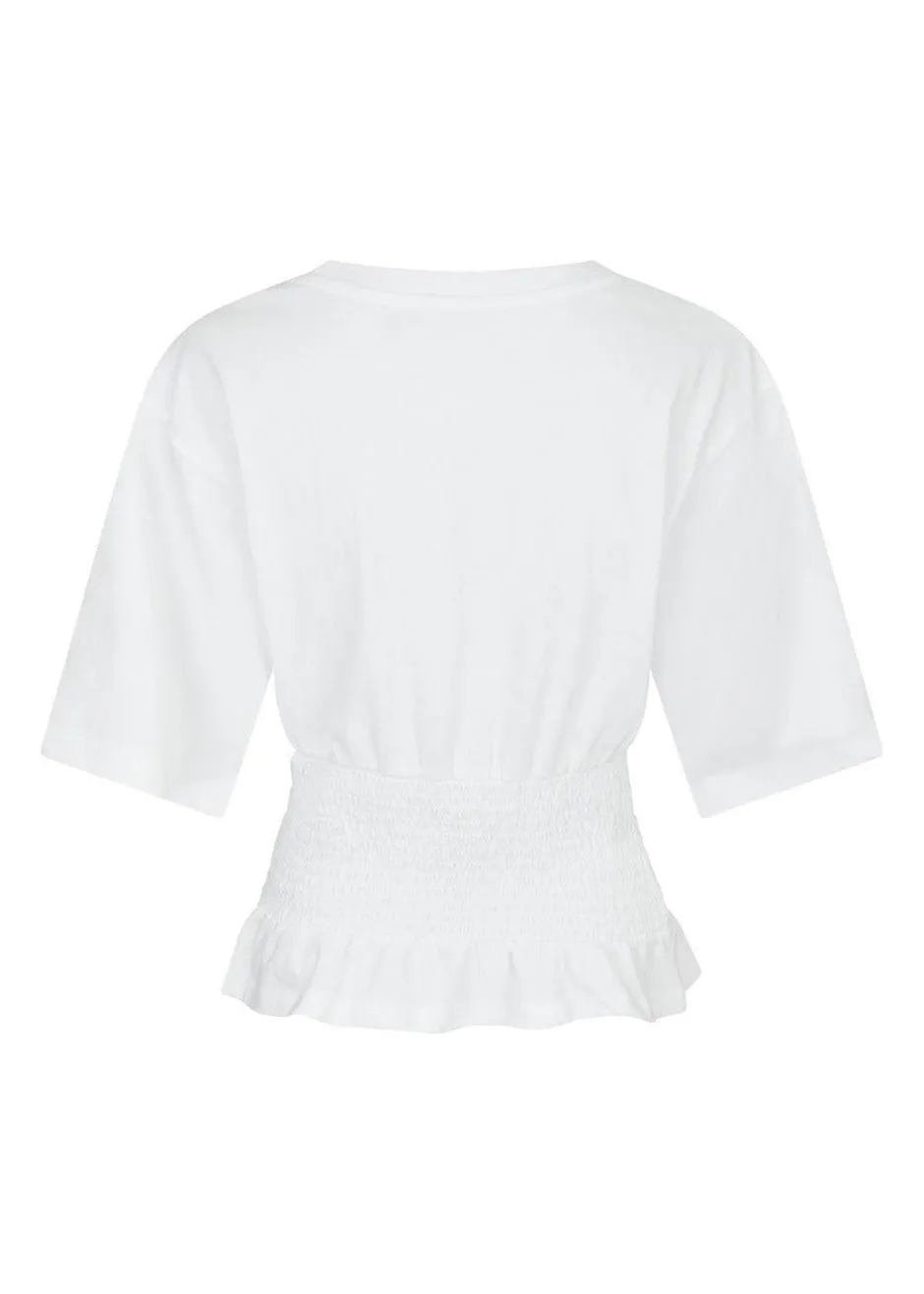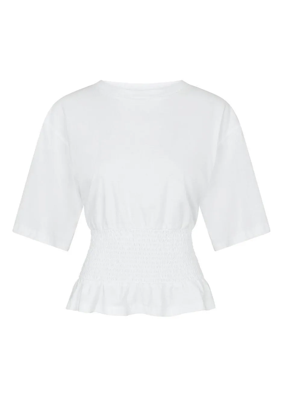 Boxy t-shirt med smocki taljen. T-shirten kommer i en lækker og blød bomuldskvalitet. Modellen er 176 cm og er iført størrelse 36.